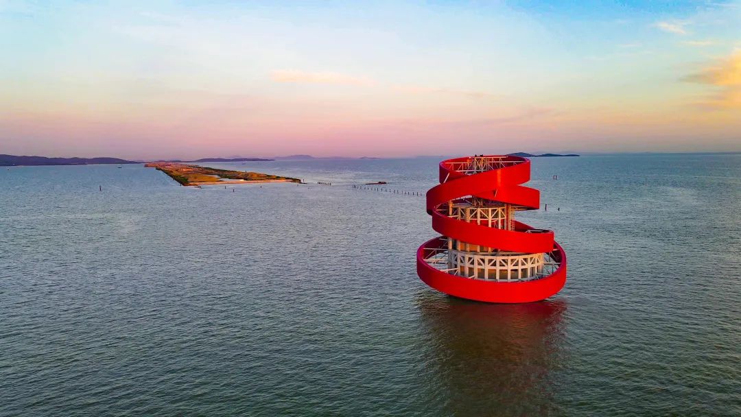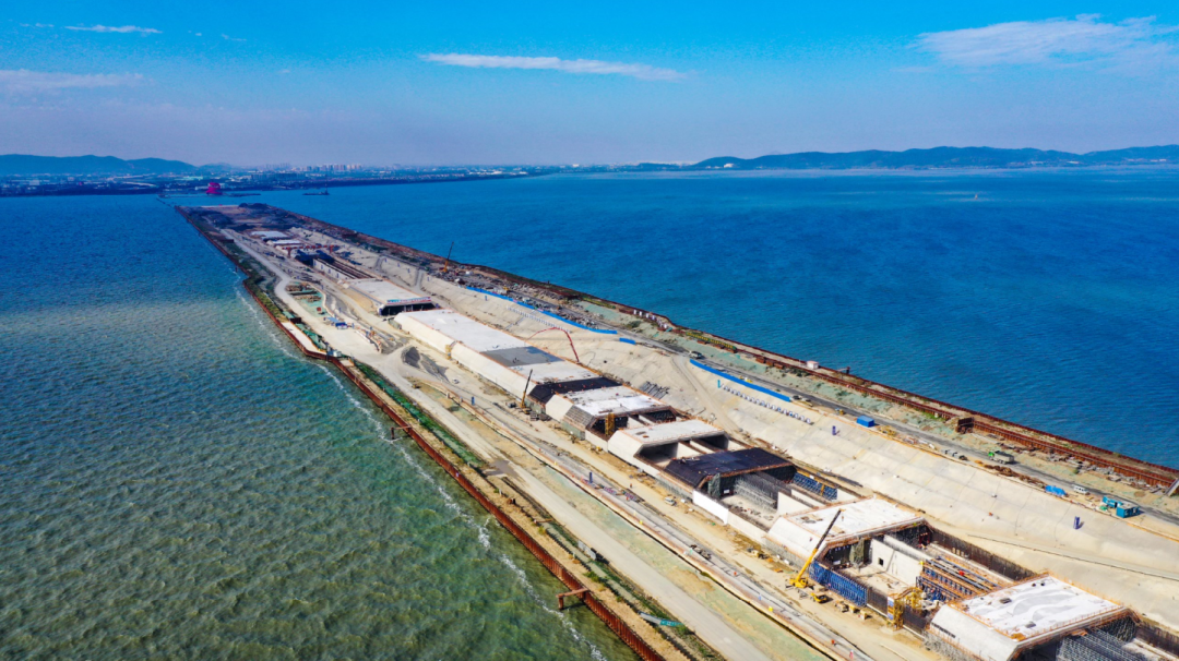 中交建设团队坚持绿色环保理念,积极打造绿色太湖隧道工程。项目部在太湖临时码头上方搭建一条高约6米、总长达700多米的“V字形”空中带式输送机,向距离临时码头200米的混凝土供应中心运送项目施工所需要的砂石料等原材料。再通过两条长约200米的皮带机,所有砂石料被精准地下料在12个料仓的指定位置。下料完成后,4台高空雾炮机不间断地喷洒水雾,把扬尘淹没在料仓里。这样的传送方式不仅解决了运输扬尘的问题,还减少了原材料陆上运送的时间成本和距离成本。