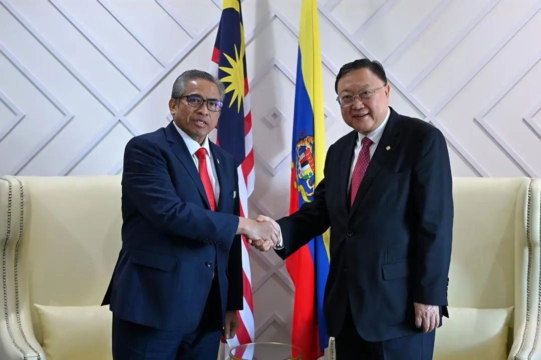 董事长王彤宙在马来西亚布城拜会马来西亚政府首席秘书、马来西亚铁路衔接公司董事会主席丹斯里三苏·阿兹里,双方就马东铁项目实施情况、运维工作和深化合作开展座谈交流,并共同见证中交马东铁项目补充协议7框架条款签约。