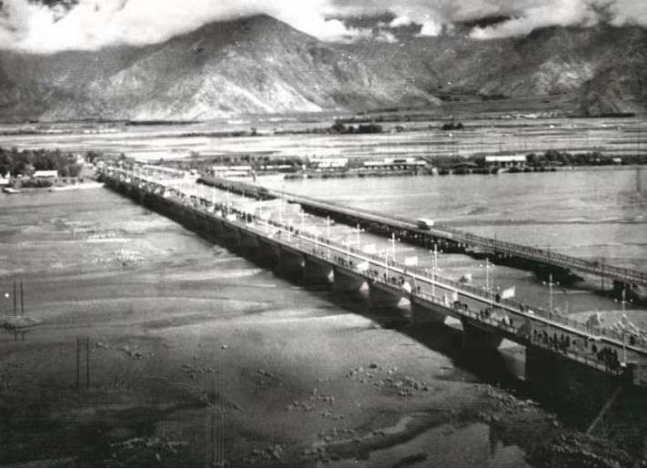 1965年8月,拉萨河上第一座钢筋混凝土T型刚构桥——拉萨大桥提前4个月通车。一张老照片留下了经典的镜头:拉萨河上,两桥并肩,10年前建成的钢木结合桥梁“光荣退休”,钢筋混凝土现代化桥梁“上岗”肩负新的使命。