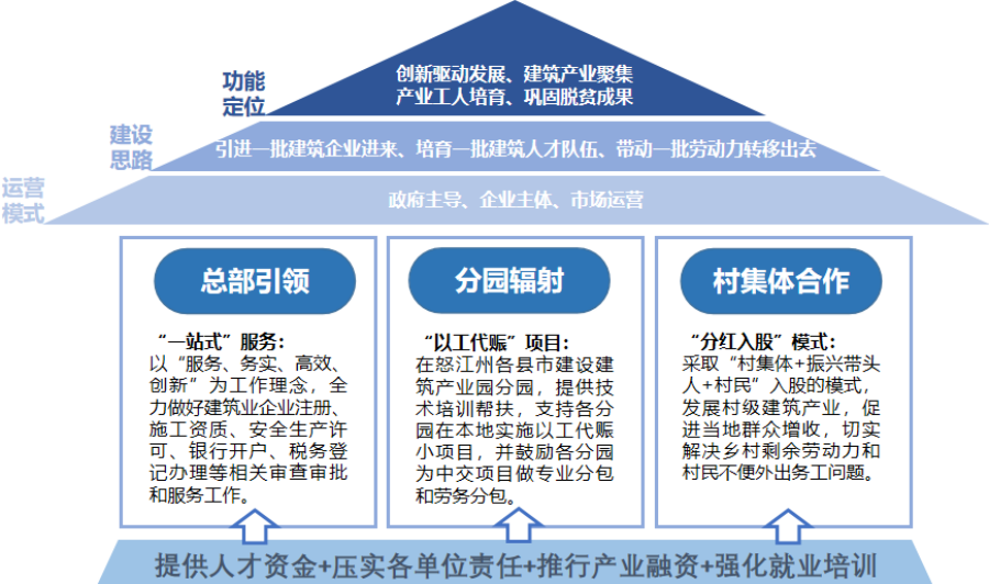 2021年1月,在怒江州委州政府支持下,中交正式启动建筑产业园项目建设,并在怒江香料产业园区设立建筑业产业园总部基地,建设思路是“引进一批建筑企业进来、培育一批本土建筑人才队伍、带动一批劳动力转移出去”;运营模式是“政府主导、企业主体、市场运营”。