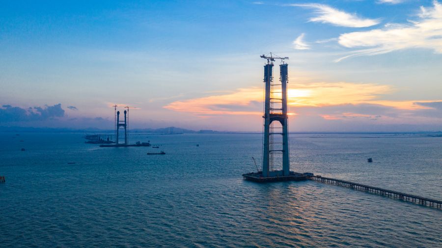 世界最大跨径海上钢箱梁悬索桥深中通道伶仃洋大桥,中交二航局自主研发建造一体化智能筑塔机,将超高混凝土桥塔的传统建造技术升级为工业化建造技术,为超高索塔建造带来革命性转型升级。