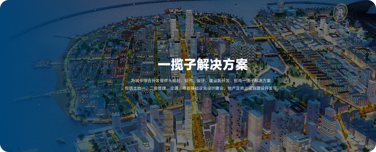为城乡综合开发提供从规划、投资、设计、建设到开发、招商一揽子解决方案,包括土地一、二级整理、交通、市政基础设施设计建设、地产及商业设施建设开发等。
