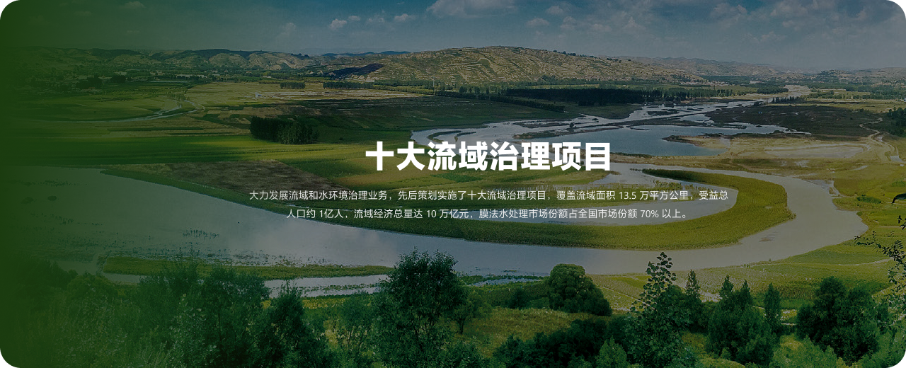 大力发展流域和水环境治理业务,先后策划实施了十大流域治理项目,覆盖流域面积 13.5 万平方公里,受益总人口约 1亿人,流域经济总量达 10 万亿元,膜法水处理市场份额占全国市场份额 70% 以上。