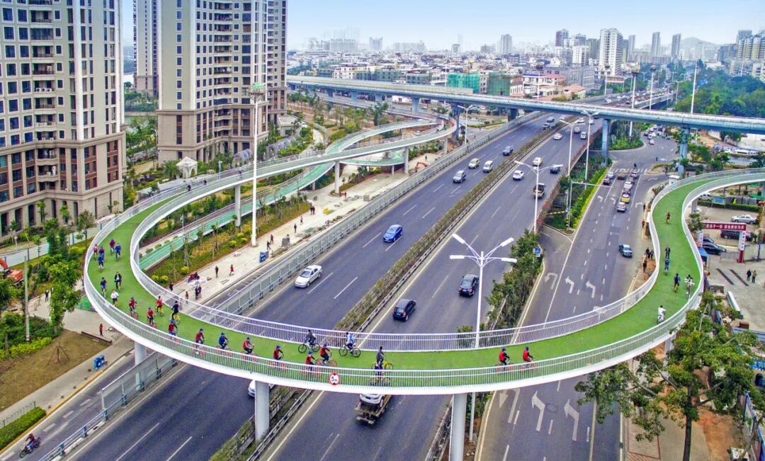 中交三航局承建的福建厦门云顶路自行车专用道是全国首条、世界最长的空中自行车道,全长7.6公里,于2017年正式建成投运。通过理念创新和技术创新,打造集约式交通空间布局,为厦门市绿色低碳出行提供更好条件。