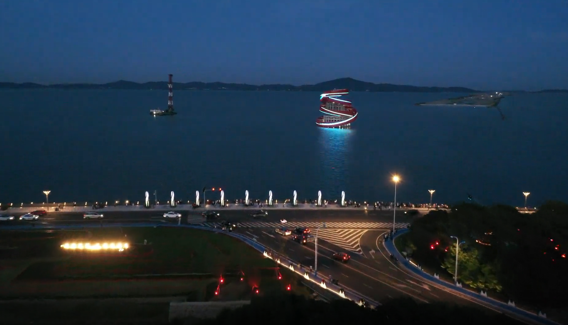 中交建设团队坚持绿色环保理念,积极打造绿色太湖隧道工程。项目部在太湖临时码头上方搭建一条高约6米、总长达700多米的“V字形”空中带式输送机,向距离临时码头200米的混凝土供应中心运送项目施工所需要的砂石料等原材料。再通过两条长约200米的皮带机,所有砂石料被精准地下料在12个料仓的指定位置。下料完成后,4台高空雾炮机不间断地喷洒水雾,把扬尘淹没在料仓里。这样的传送方式不仅解决了运输扬尘的问题,还减少了原材料陆上运送的时间成本和距离成本。