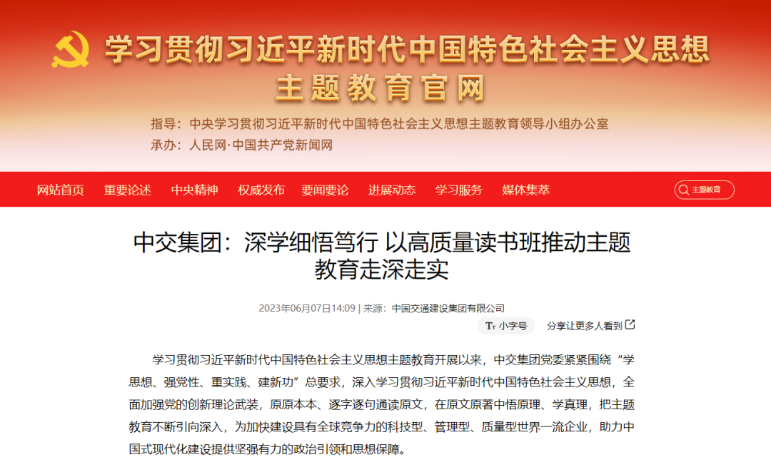 党委紧扣学习贯彻习近平新时代中国特色社会主义思想主题教育主线,坚持读原著、学原文、悟原理,通读、精读、研读党的二十大报告、党章以及《习近平著作选读》《习近平新时代中国特色社会主义思想专题摘编》等中央指定书目,学好用好国资委党委编印的重要学习读本,系统思考和把握习近平总书记关于国有企业改革发展和党的建设工作的重要论述。通过学习研讨,更加深刻认识到,“两个确立”在政治上确立了领路人和主心骨,在思想上确立了定盘星和指南针,必须坚定捍卫“两个确立”、坚决做到“两个维护”;更加深刻认识到,习近平新时代中国特色社会主义思想是做好国有企业一切工作的“源头活水”,必须持续学、反复学、跟进学,练就党员干部的“看家本领”;更加深刻认识到,党的优良传统作风是党自我革命的制胜法宝,必须扑下身子、走向基层,大兴调查研究之风;更加深刻认识到,必须准确把握新时代国有企业的使命定位,坚定不移做强做优做大国有企业,为推动中国式现代化取得新进展新突破贡献中交力量。