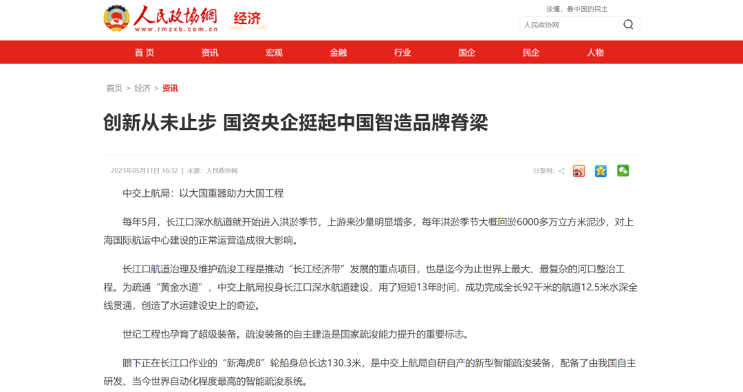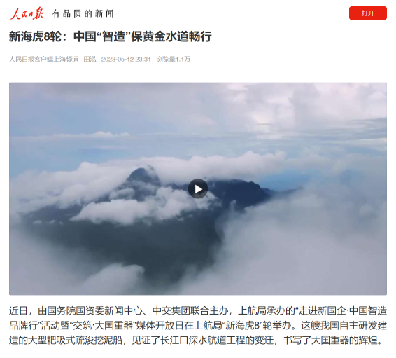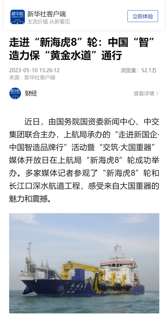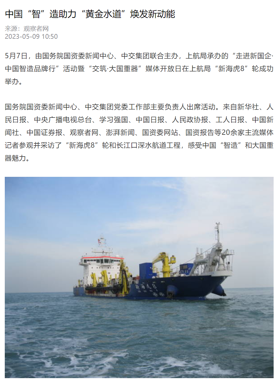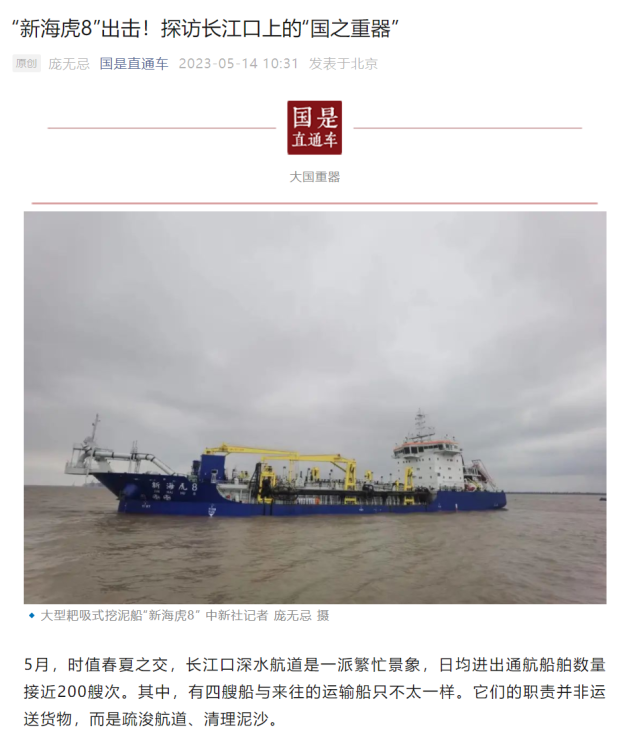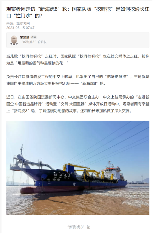 观察者网客户端再次刊发报道,“新海虎8”轮,开创了我国自主建造万方级大型耙吸挖泥船的先河,打破了国外对大型疏浚船舶建造技术的垄断和封锁,提升了民族造船工业的综合能力。