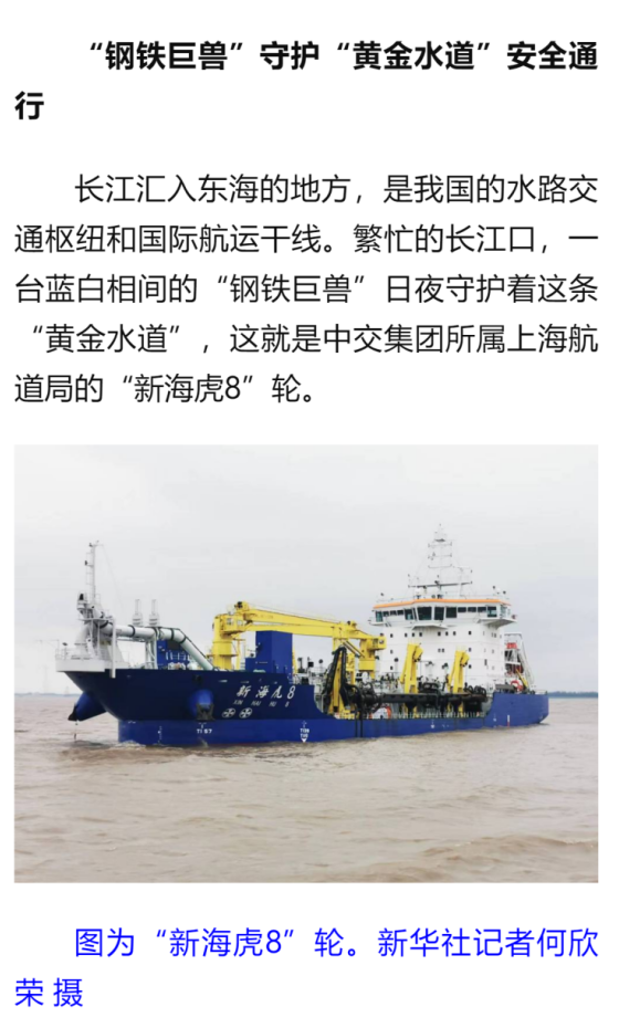 新华社客户端再次刊发报道,长江汇入东海的地方,是我国的水路交通枢纽和国际航运干线。繁忙的长江口,一台蓝白相间的“钢铁巨兽”日夜守护着这条“黄金水道”,这就是上航局的“新海虎8”轮。