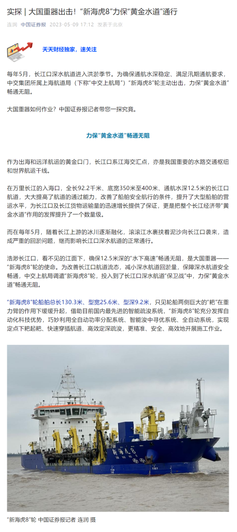 “中国证券报”微信公众号刊发报道,“新海虎8”轮充分发挥自动化科技优势,巧妙利用全自动功率分配系统、智能浚中寻优系统、全自动系统,实现定点下耙起耙、快速穿插航道、高效定深疏浚,更精准、安全、高效地开展施工作业。