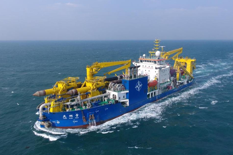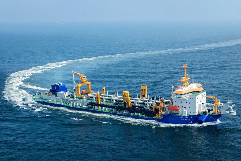 该船船长170.2米,舱容量21028立方米,满载航速16.3节,满载排水量48351吨,最大挖深达90米,具备全球无限航区航行能力。船舶采用先进的双耙水下泥泵挖泥工艺,搭配环保溢流装置,集耙吸装舱、艏喷、排岸功能于一体,广泛应用于疏浚吹填、深水取砂、深海管沟开挖及回填造陆等工程领域,实现“一船多能、全域适配”。投产以来,“浚洋1”先后参与了斯里兰卡科伦坡港口城、马尔代夫系列疏浚工程等“一带一路”标杆项目;助力广东湛江港30万吨级航道改扩建、江苏连云港港30万吨级航道二期等项目建设,不仅享誉全球,更成为引领全球疏浚行业技术与效率标准的标杆装备。