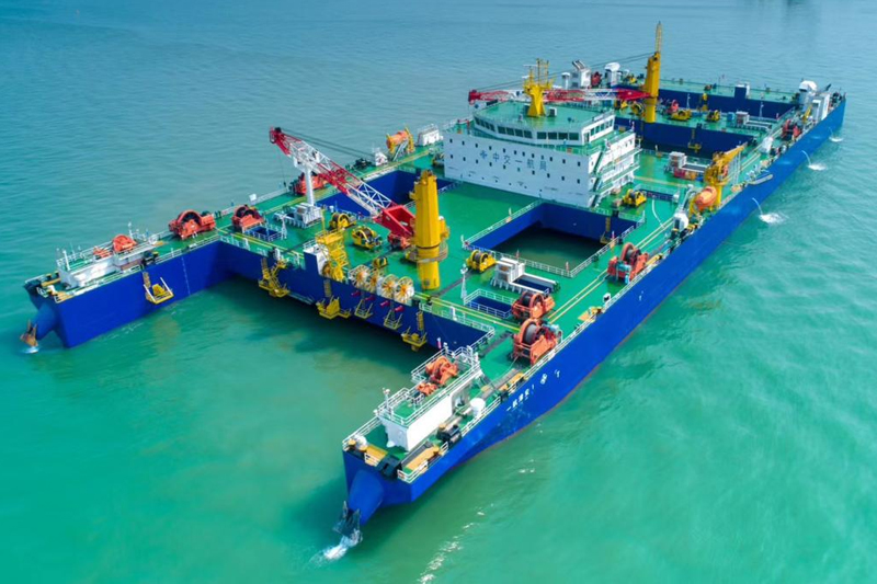世界首艘集沉管浮运、定位、沉放和安装等功能于一体的自航式沉管运输安装一体船。该船采用双船体船型设计,船长195米,型宽75米,型深14.7米,双片体内侧跨距56.8米,甲板面积相当于两个标准足球场。该船为国际首创,可满足80000吨沉管的长距离运输和50米水下的毫米级安装。该船总装机功率达3万马力,釆用DP定位,低速航行时可实现自动循迹航行功能。