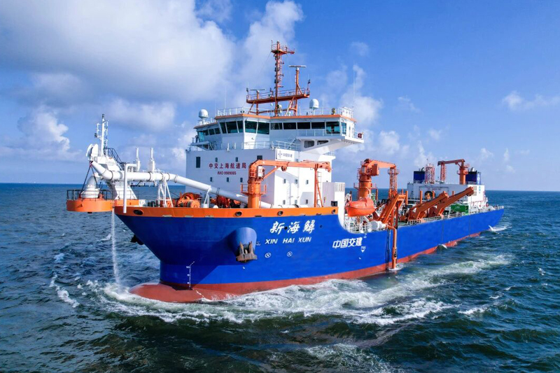 国内首制、世界最大舱容LNG清洁能源动力耙吸挖泥船,船长151.7米,泥舱最大舱容达16808立方米,采用LNG与柴油双燃料动力系统,配置1580立方米LNG双耳罐,年疏浚能力达1600万立方米。该船首次使用LNG燃料和先进的综合智能管理平台,达到IMO Tier Ⅲ排放标准,全生命周期可减少碳排量约41.69万吨,形成了多项核心专利,入选中国三级片 “绿色低碳专项方案”“上海港航绿色发展应用案例”,为LNG动力在疏浚行业的规模化应用奠定基础。“新海鲟”轮的投产填补了国内清洁能源在疏浚行业应用的空白,为国内疏浚行业绿色发展树立标杆,推动了我国绿色疏浚装备的技术升级。
