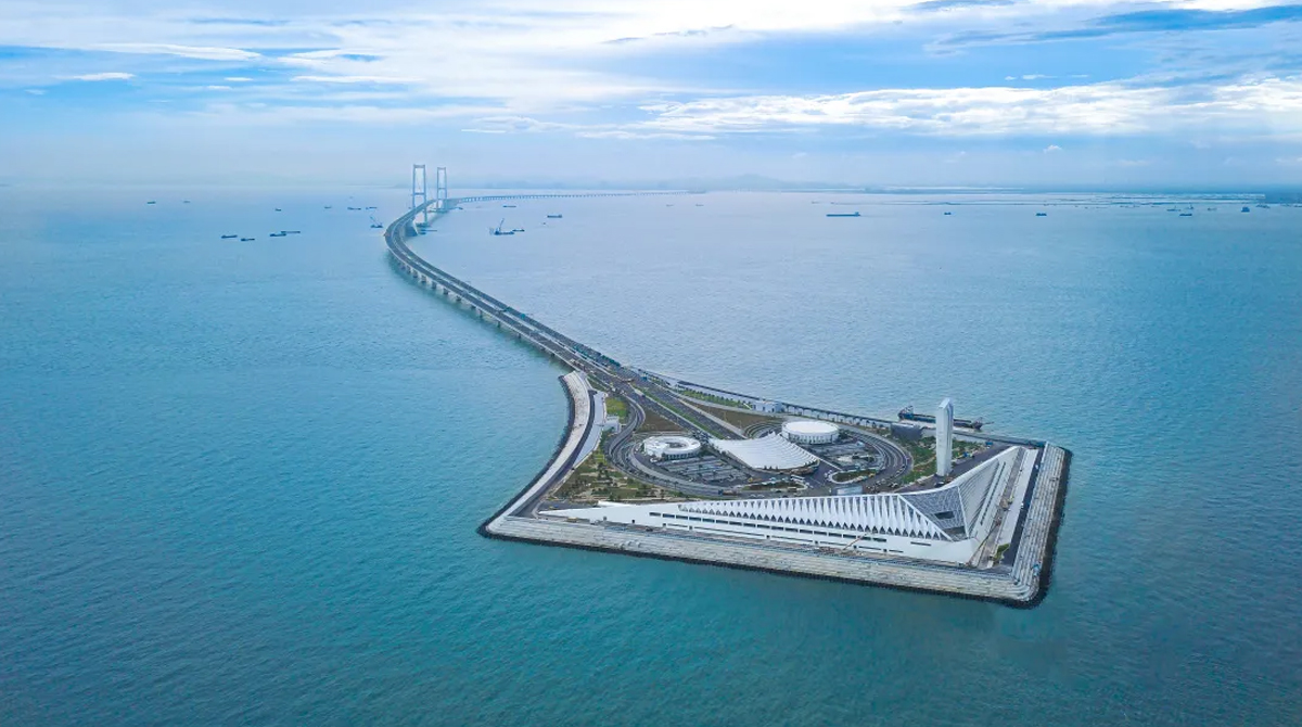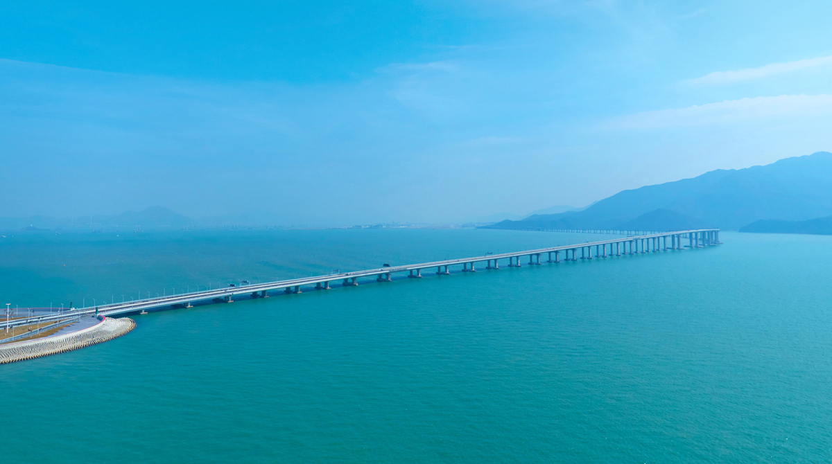港珠澳大桥全长55公里,是世界上最长的跨海大桥,同时拥有世界最长的公路沉管隧道和唯一的深埋沉管隧道。该桥被英国《卫报》评为“新世界七大奇迹”。港珠澳大桥的建成将粤港澳三地纳入“一小时生活圈”,三地人民“你中有我,我中有你”,形成一家亲,成为一家人,有力推动了粤港澳大湾区共同繁荣,在中华民族复兴史上留下浓墨重彩的篇章。